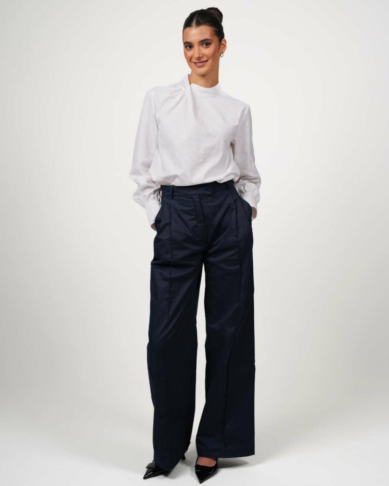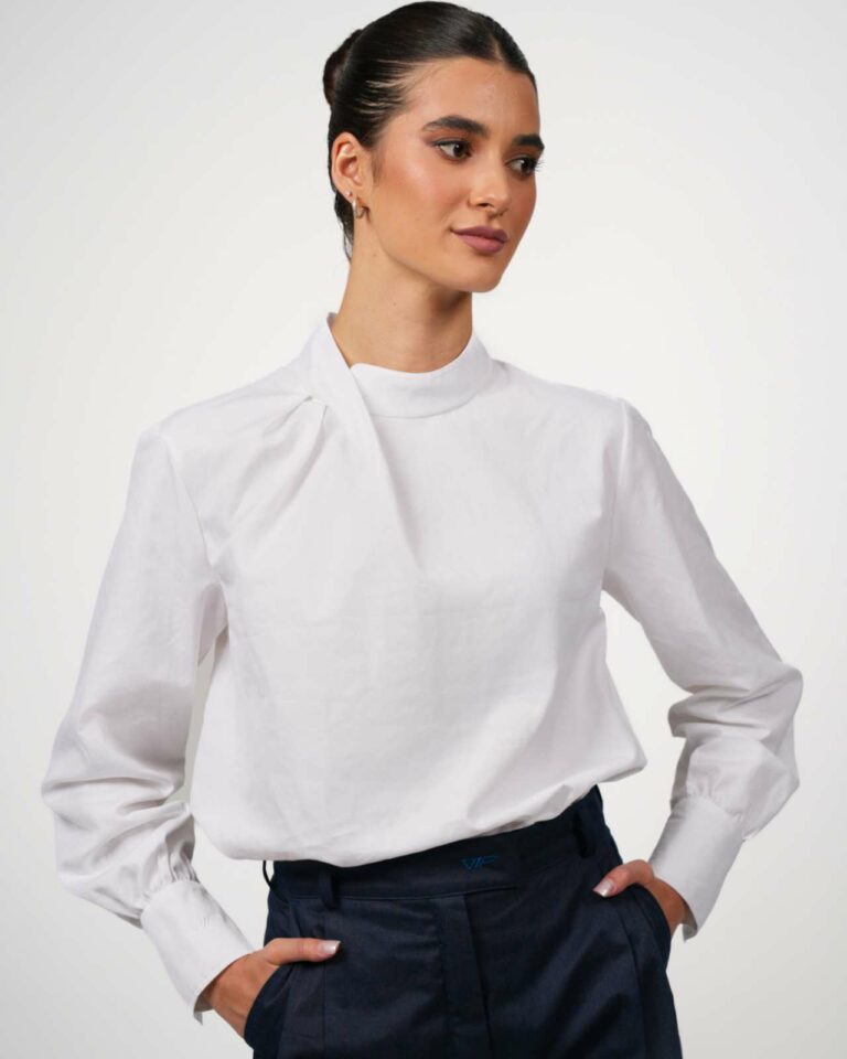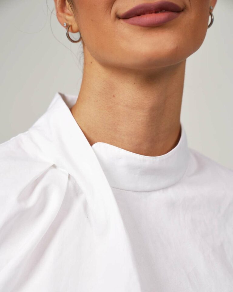 Ob für Meetings, Events oder entspannte Freizeitlooks – die Bluse mit Kragendetail besticht durch ihr klares, zeitloses Design mit raffiniertem Detail. Der gerade Schnitt sorgt für eine klassische Silhouette, während das besondere Twist-Detail am Stehkragen moderne Spannung verleiht.